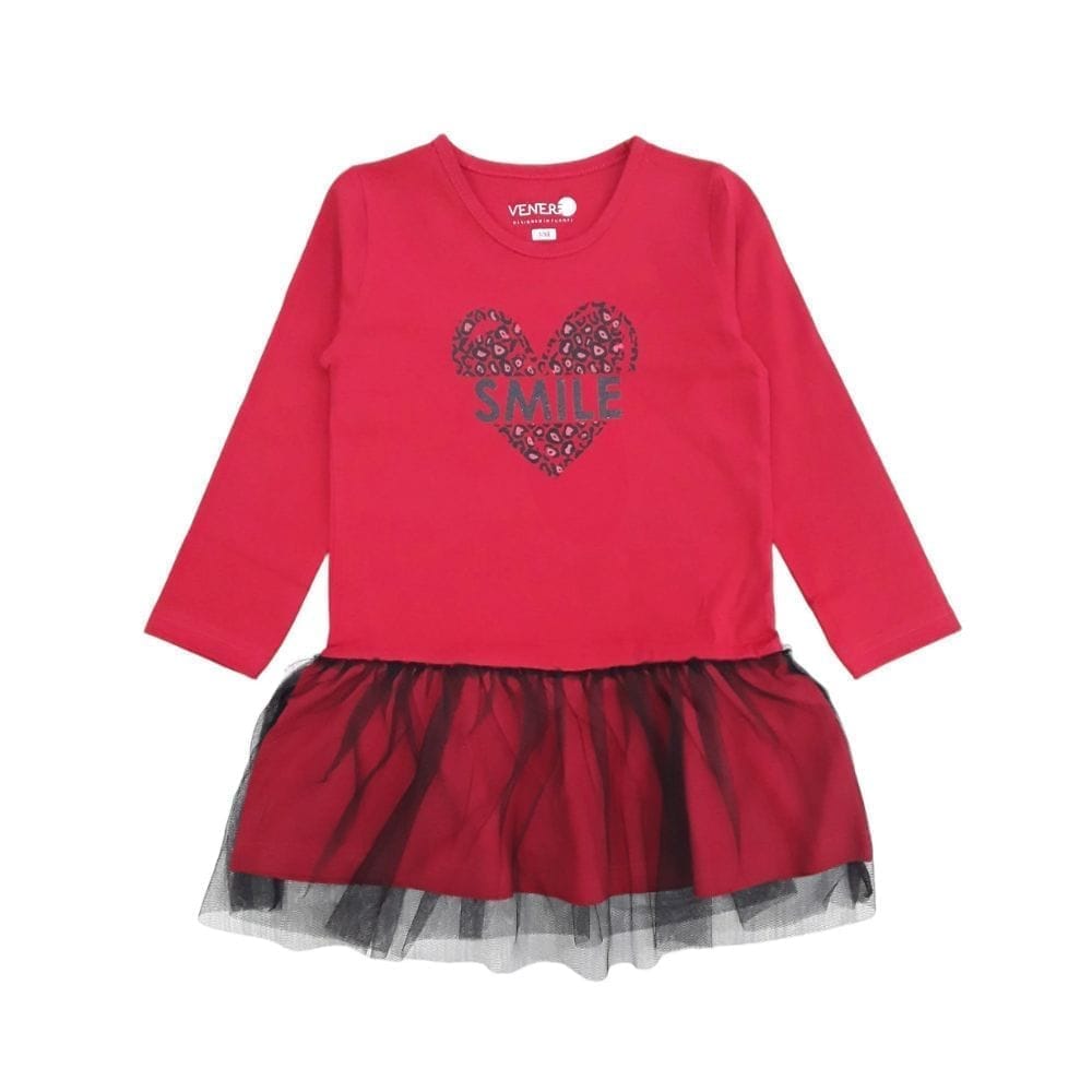 Rdeča obleka za deklice Venere je prijetna za nošenje in se lepo kombinira s črnimi pajkicami. Je modna in udobna, ter zato primerna tako za vrtec ali šolo, kot za prosti čas in igro.